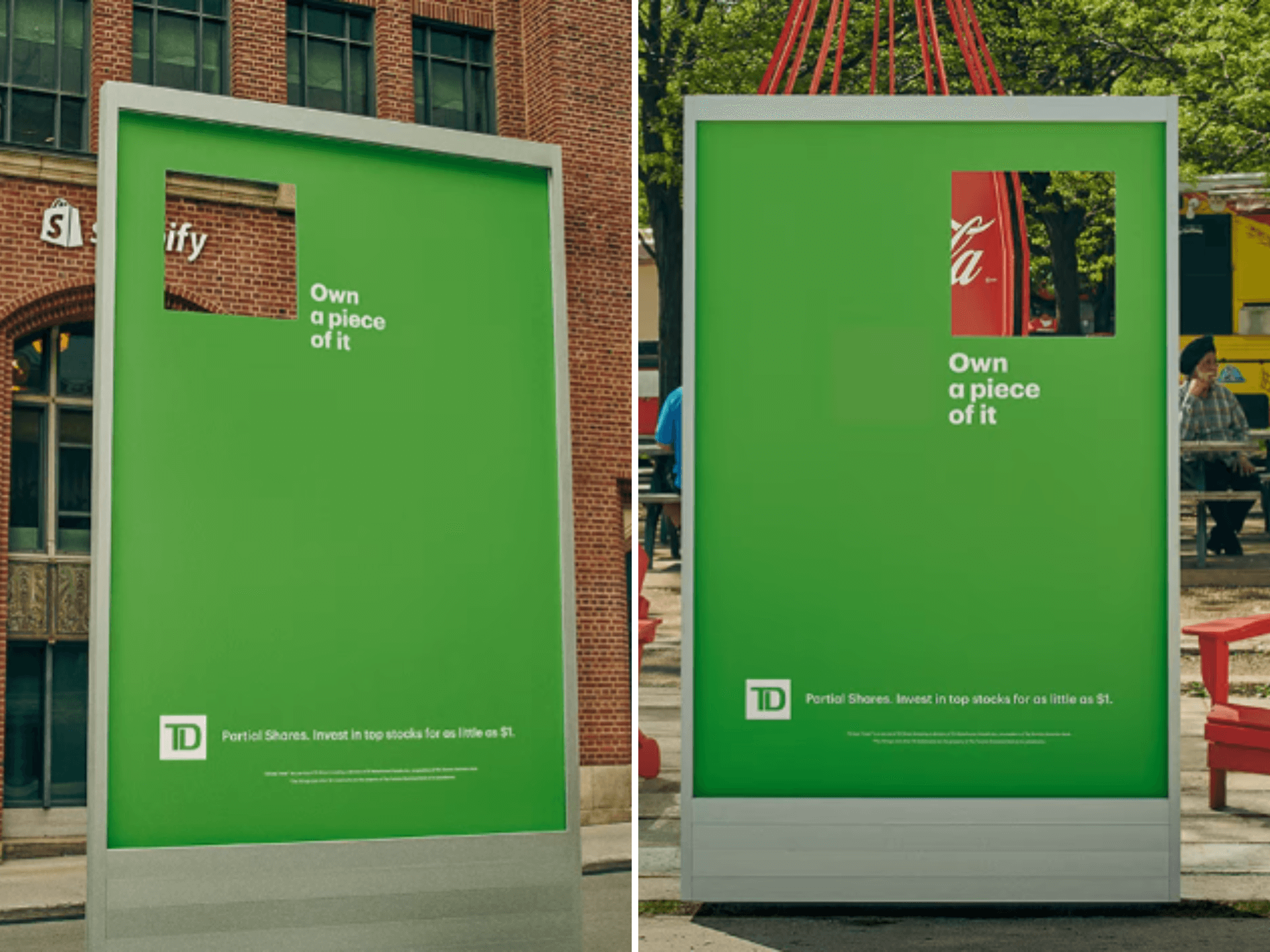 El banco canadiense TD Bank ha presentado una campaña de publicidad exterior para explicar las acciones fraccionadas, un servicio que permite invertir en una parte de una acción sin necesidad de comprarla en su totalidad. La propuesta surgió a raíz de una limitación legal: no podían mostrar logotipos completos de marcas reconocidas como Apple, Google o Coca-Cola.
