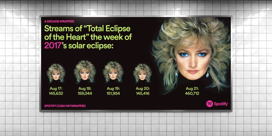 Otro de los anuncios revela cómo los oyentes alrededor del mundo parecen confiar cada vez más en los clásicos de los 80, documentando como las transmisiones de Bonnie Tyler sobre el tema Total Eclipse of the Heart es la canción más escuchada durante un eclipse solar.
