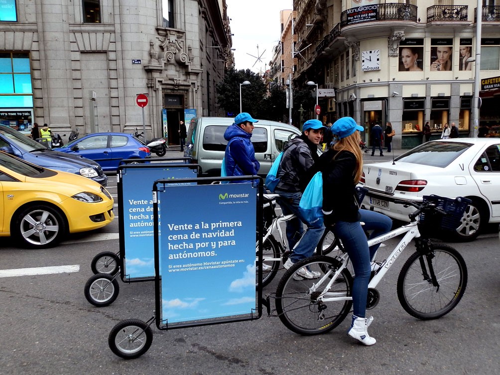 Otro ejemplo de Street Marketing, en este caso desarrollado por Movistar, en donde el soporte elegido son bicicletas con paneles anexados en su parte posterior. Se trata de una invitación a una cena navideña para sus clientes autónomos. Ante una caída de este tipo de clientes, la empresa de telefonía pensó en una forma de fidelizar a quienes confían en sus servicios y -por qué no- atraer a nuevos emprendedores.